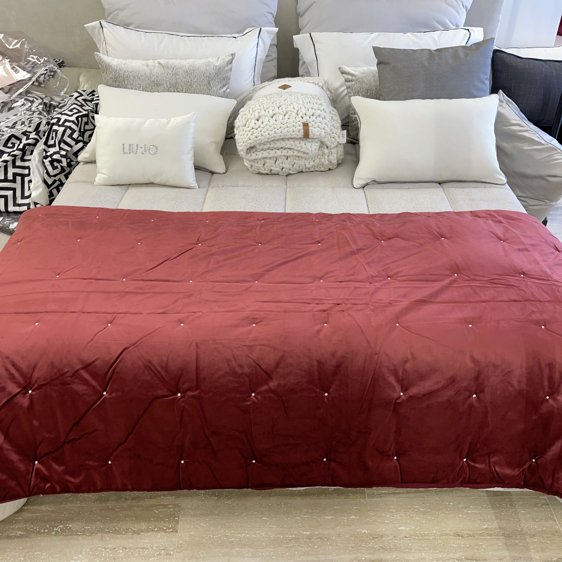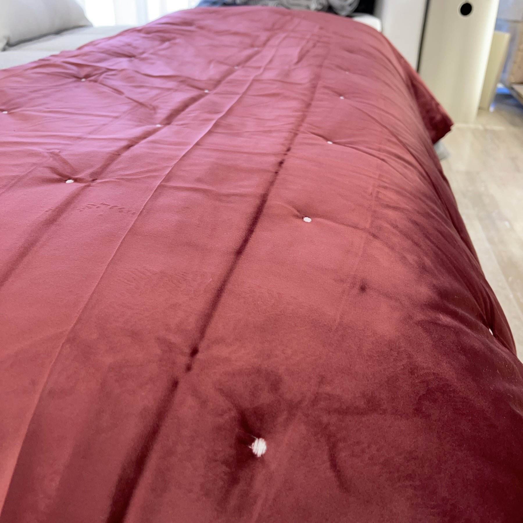 Piumone artigianale in velluto in microfibra con fodera di raso in cotone.